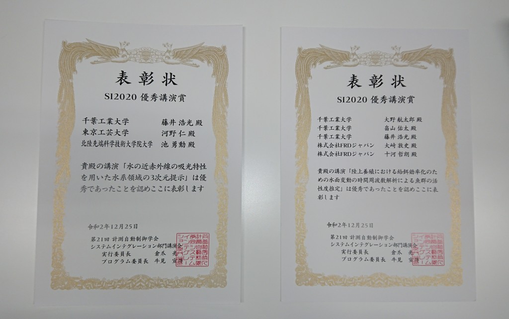 - 大野 航太郎,畠山 佑太,藤井 浩光,大﨑 敦史,十河 哲朗: “陸上養殖における給餌効率化のための水面変動の時間周波数解析による魚群の活性度推定”, 第20回計測自動制御学会システムインテグレーション部門講演会(SI2019), 1G2-10, 福岡(オンライン), December 2020. (SI2020優秀講演賞 受賞)