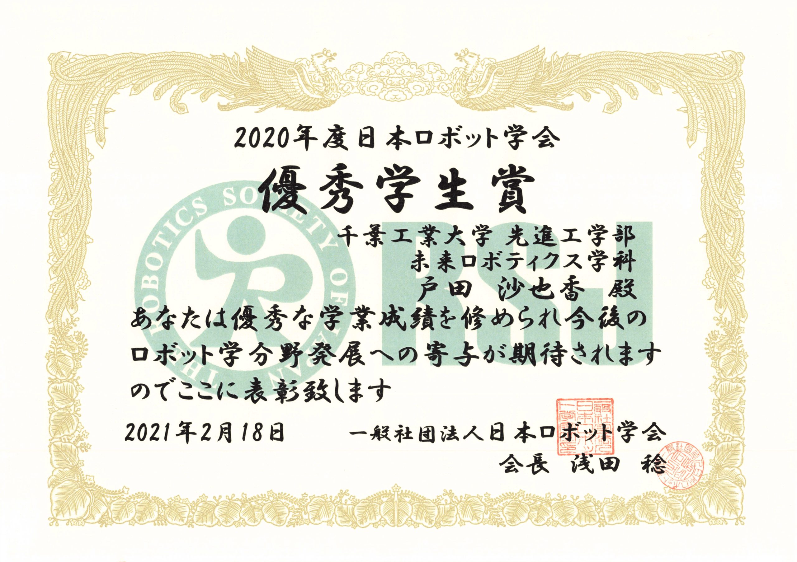 - 日本ロボット学会 優秀学生賞:戸田 沙也香 さん