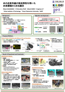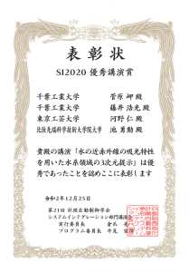 • 菅原 岬, 藤井 浩光, 河野 仁, 池 勇勲: “水の近赤外線の吸光特性を用いた水系領域の3次元提示”, 第21回計測自動制御学会システムインテグレーション部門講演会(SI2020), 1A3-10, 福岡(オンライン), December 2020. (SI2020優秀講演賞 受賞)