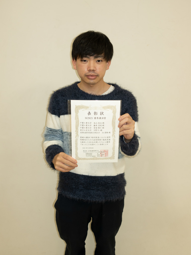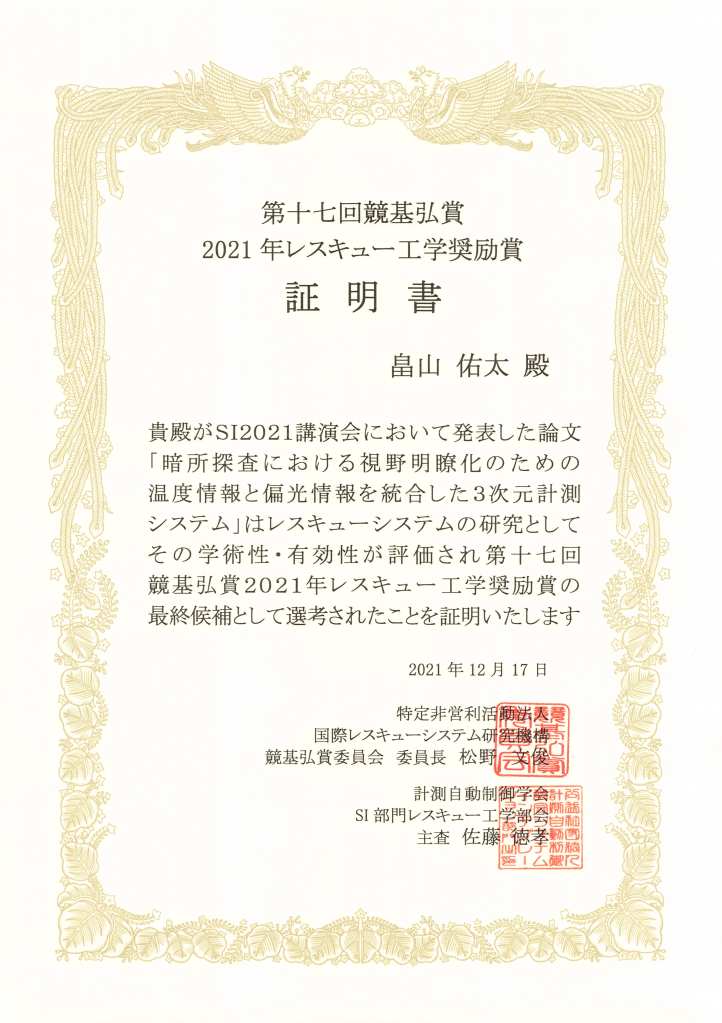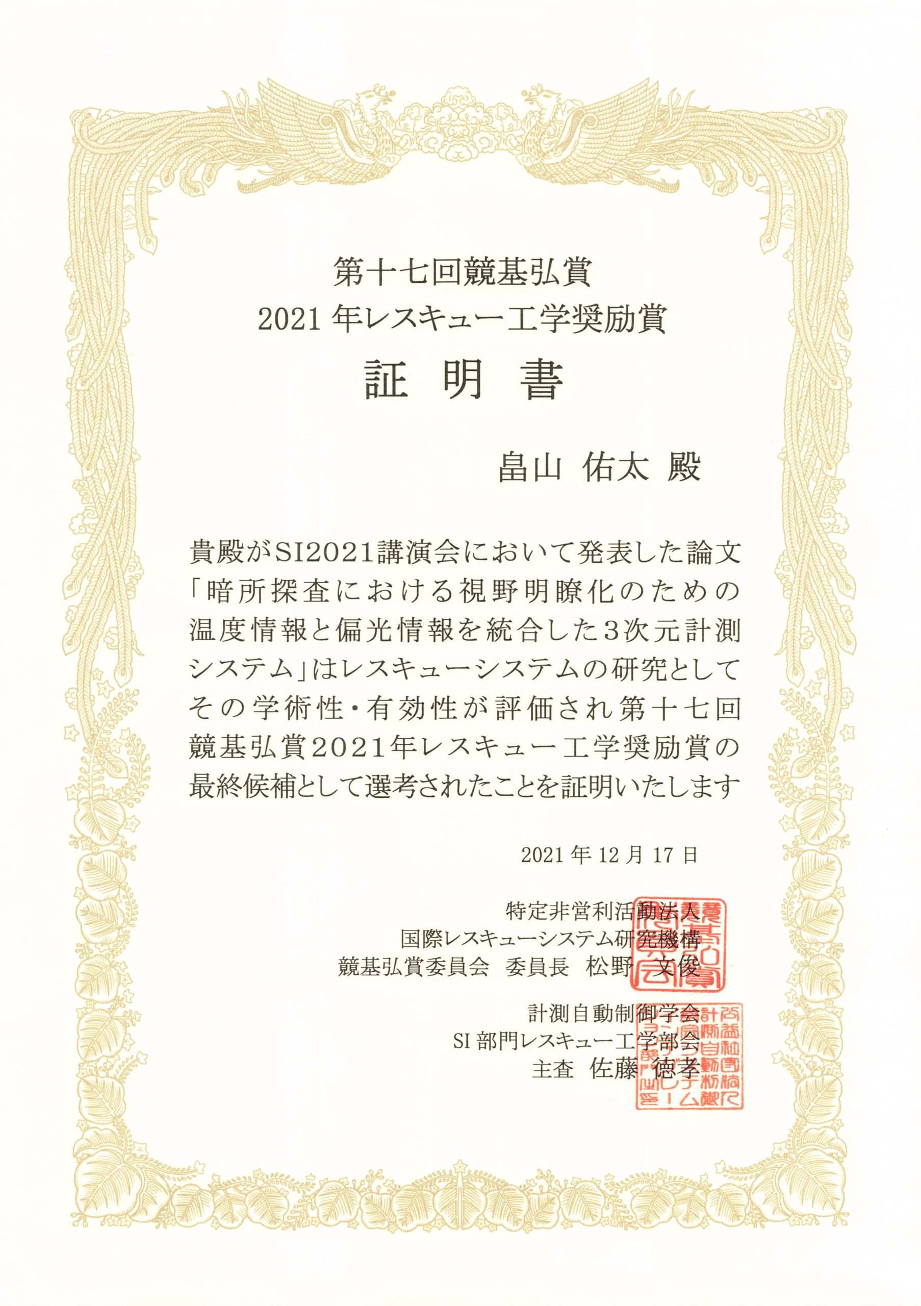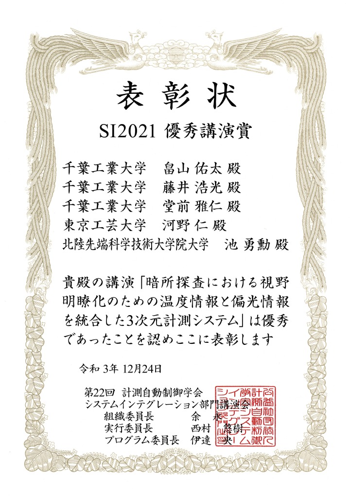 • 畠山 佑太,藤井 浩光,堂前 雅仁,河野 仁,池 勇勳: “暗所探査における視野明瞭化のための温度情報と偏光情報を統合した3次元計測システム”, 第22回計測自動制御学会システムインテグレーション部門講演会(SI2021), 1A2-01, オンライン開催, December 2021.(第17回 竸基弘賞 2021年レスキュー工学奨励賞 最終候補者,SI2021優秀講演賞 受賞)